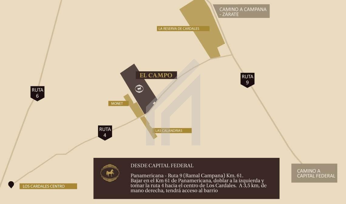 Lote en venta en barrio EL CAMPO Cardales lote de 1003 mts. orientación Este el lote tiene 14,11 mt de frente, 45,82 mts de largo y 30,08 mts de fondo Situado en la etapa 1 donde ya se puede construir, con caminos consolidados, adoquinado y servicios subterraneos de luz, tv por cable, telefonia e internet. Cloacas, red de agua corriente y red de riego. expensas marzo $440.000.- FORMA DE PAGO: SE ACEPTA PERMUTA POR VEHICULO, OTRO INMUEBLE, EFECTIVO, amplias facilidades!!! consultame y hacemos la propuesta EL CAMPO – AMPLIAS VISTAS. ECO URBANIZACIÓN. DISTINCIÓN Y ESTILO ECUESTRE – En un entorno silvestre con atardeceres de ensueño, El Campo abre en la zona de Cardales una propuesta exclusiva para disfrutar de la vida en familia y en contacto con la naturaleza. Su arboleda centenaria, el lago central y el espíritu del lugar rescatan lo mejor de la tradición ecuestre para dar forma a un proyecto único. El Campo, Fincas Exclusivas Cardales, ofrecen estilo de vida en contacto con la naturaleza a través de un bosque central imponente, una laguna majestuosa y un hermoso paisaje agreste. Abarca aproximadamente 450 lotes, en su mayoría con expansión al bosque. La urbanización ecológica del predio logra alcanzar la armonía y la integración del emprendimiento, a partir de un trazado inteligente de circuitos para recorrer El Campo a caballo, en bicicleta o simplemente a pie. Con instalaciones de primer nivel, pista de saltos hípicos, acceso exclusivo a La Mora Polo Club Cardales y caballerizas. A tan sólo 45 minutos de la Ciudad de Buenos Aires, en un ambiente seguro y relajado. CARACTERÍSTICAS: • Superficie total: 100 has. • Lotes desde 1000 m2, con expansión al bosque. • Aproximadamente 400 lotes. • Urbanización ecológica y trazado inteligente. • Gran bosque central con laguna. • Acceso directo a ruta 4. • Entrada principal y de servicios. • SUM | Área de Restó. • Área de Hotel Boutique. ............................... Corredor Responsable: Norma Sandoval CUCICBA 8532 / CSI 6950 .................................. La venta de dicho inmueble está supeditada a que el propietario trámite ante la AFIP el C.O.T.I. Las medidas son aproximadas a título informativo las reales surgirán del título de propiedad.